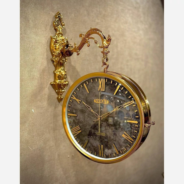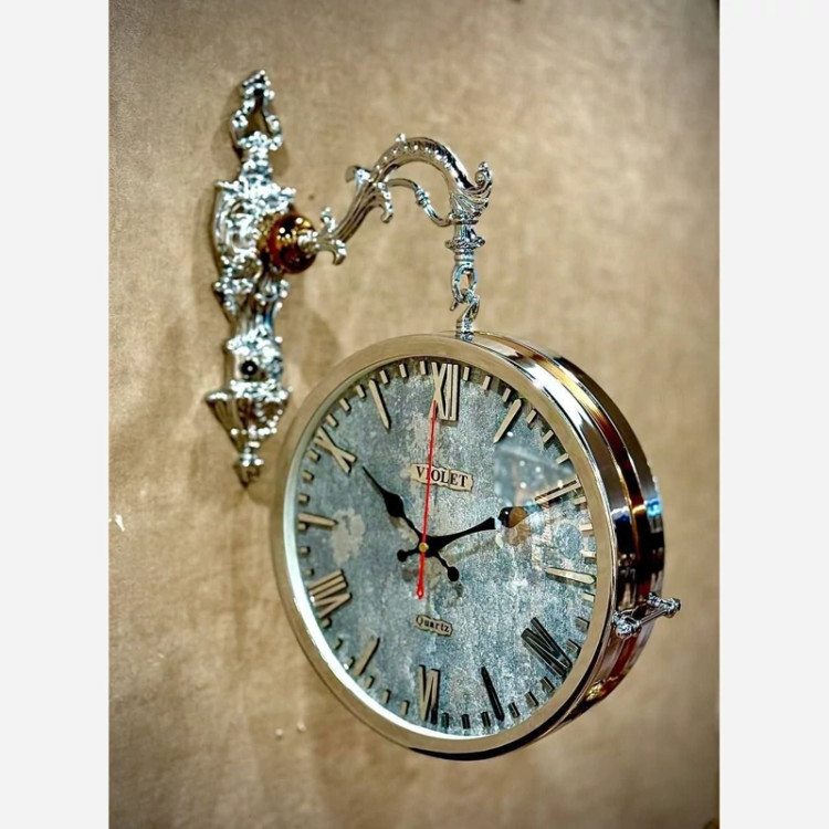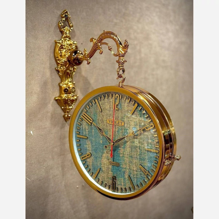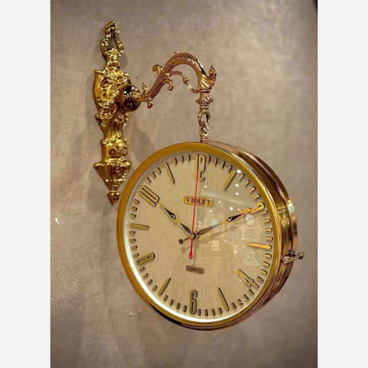 ساعت دو طرفه تمام فلزی با دوموتور. مجزا موتور آرام گرد بیصدا آبکاری فلزی. طلایی و سیلور مناسب برای روی ستون منزل مناسب برای سالن های ال مانند