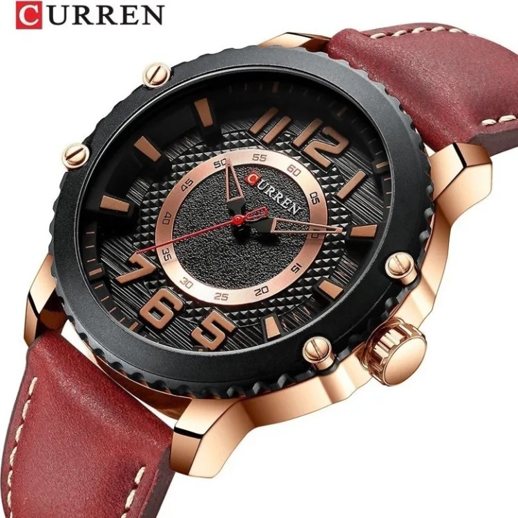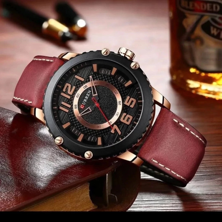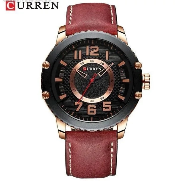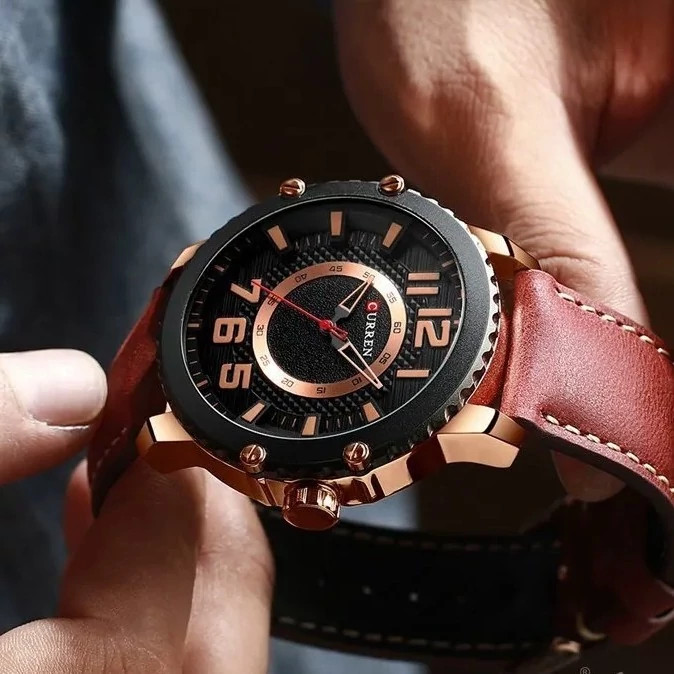 ((رنگ بند کمی کمرنگتر از عکسه)) شیشه ضد خش . ضد آب 3atm . بند چرم مصنوعی بنده آلیاژ زینک باتری یدک عقربه ها شب نما قطر صفحه 48mm وزن 103 گرم ((ارسال در کاور کارن و جعبه watch) محصول اورجینال با موتور ژاپنی دقت کنید :ساعتهای که کارن((CUREEN)) نوشته شده فیک هستند