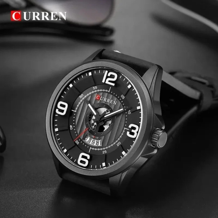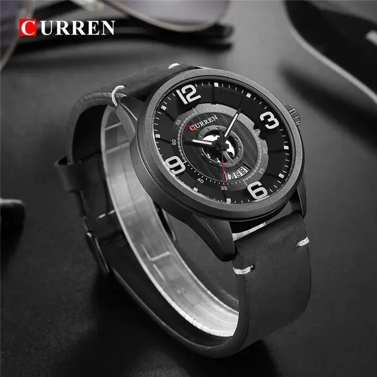 شیشه ضد خش . ضد آب 3atm . بند چرم مصنوعی بنده آلیاژ زینک باتری یدک عقربه ها شب نما قطر صفحه 47mm وزن 103 گرم ((ارسال در کاور کارن و جعبه watch) محصول اورجینال با موتور ژاپنی دقت کنید :ساعتهای که کارن((CUREEN)) نوشته شده فیک هستند