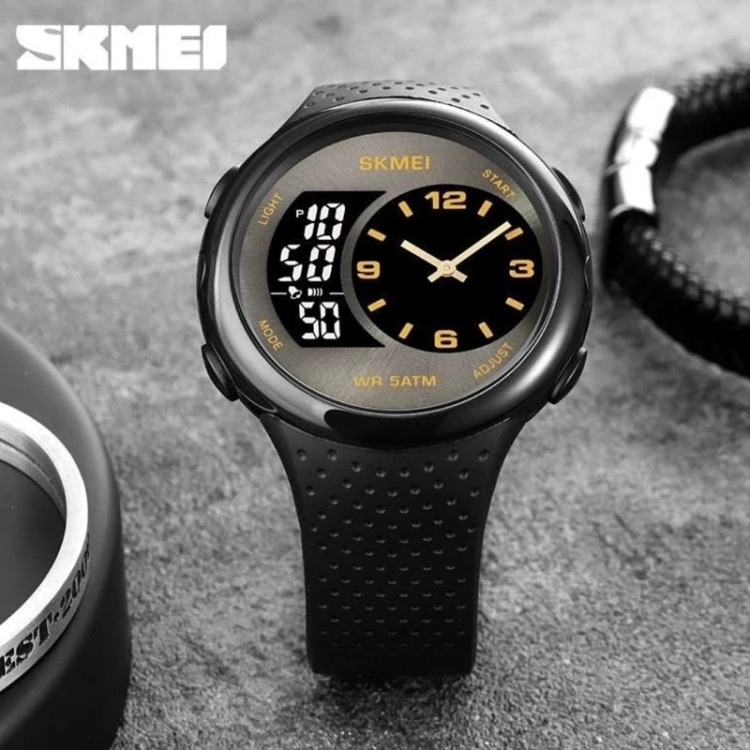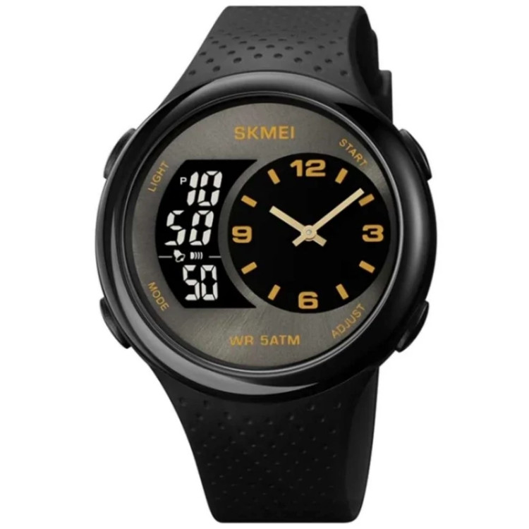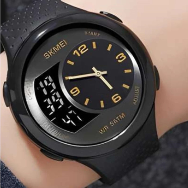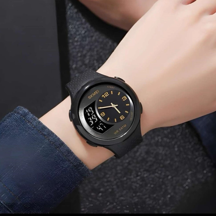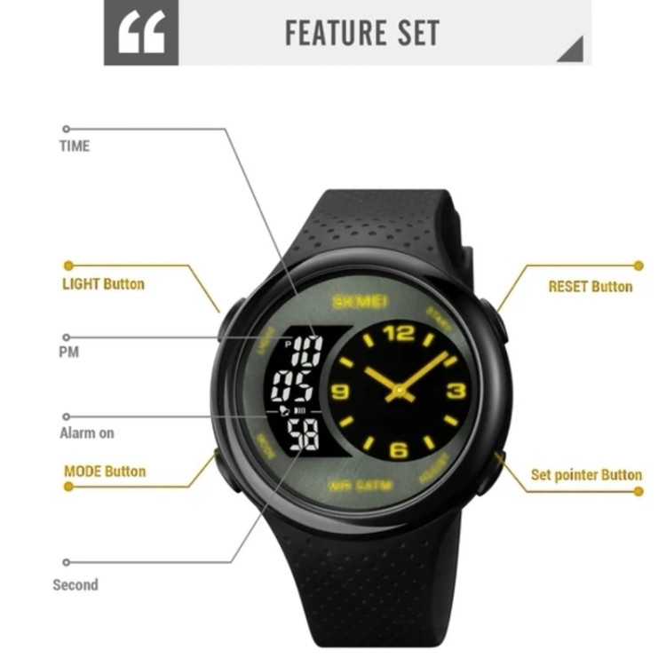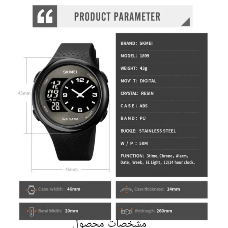 موتور ژاپن . ضد آب 3atm . ((رنگ عقربه و اعداد شبیه عکسیه که روی دسته)) جعبه اصلی بند pu باتری یدک اورجینال دو زمانه دیجیتال و یک آنالوگ کرنومتر آلارم تقویم نور پشت صفحه قطر صفحه 45mm ضد آب در حد دست شستن