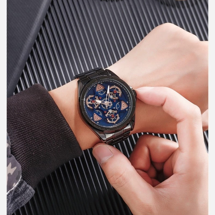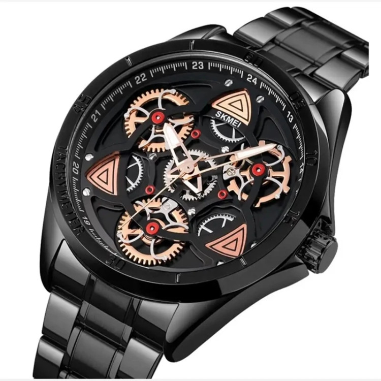 چرخ دنده ها تزئینی هستند و با حرکت دست میچرخند رنگ صفحه مشکی موتور ژاپن قابل تعمیر (پرسی نیست) ضد آب 3atm شیشه معدنی قطر صفحه 47 میلیمتر وزن 140گرم ضد حساسیت .ضد زنگ کارت گارانتی یکساله اینترنشنال