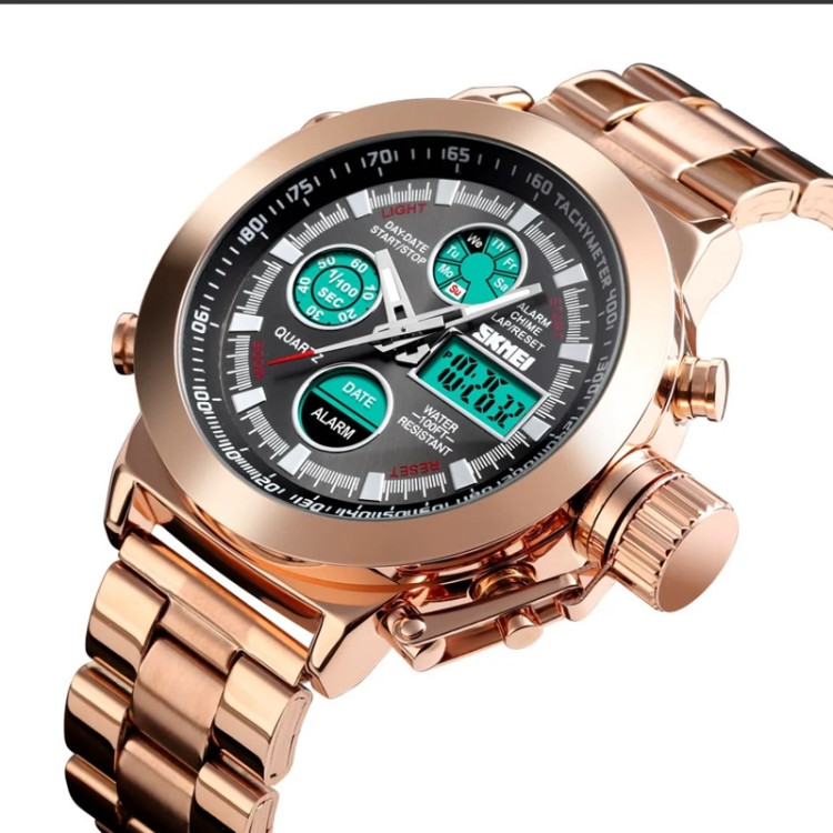 رنگ رز گلد (مسی) ضد آب 100ft .موتور ژاپن ++A. بندو بدنه استیل مقاوم ضد زنگ ضد حساسیت . رنگ ثابت . شیشه معدنی. ضد آب . شیک . بزرگ وسنگین 177 گرم دوزمانه باتری یدک جعبه اصلی