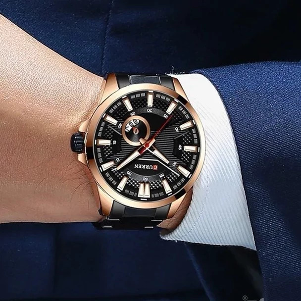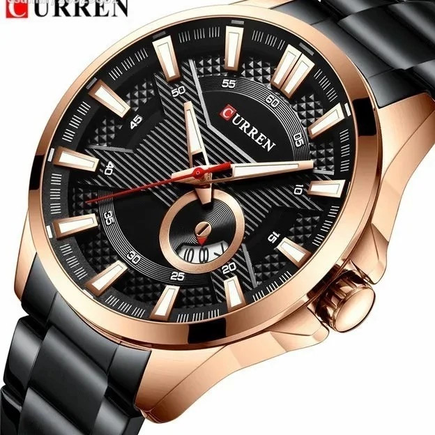 رنگ صفحه بند مشکی قاب رزگلد براق شیشه ضد خش . ضد آب 3atm . بند استیل ضد زنگ ضد حساسیت بنده آلیاژ زینک باتری یدک عقربه ها شب نما قطر صفحه 46mm وزن 103 گرم ((ارسال در کاور کارن و جعبه طرح چوب watch) محصول اورجینال با موتور ژاپنی دقت کنید :ساعتهای که کارن((CUREEN)) نوشته شده فیک هستند