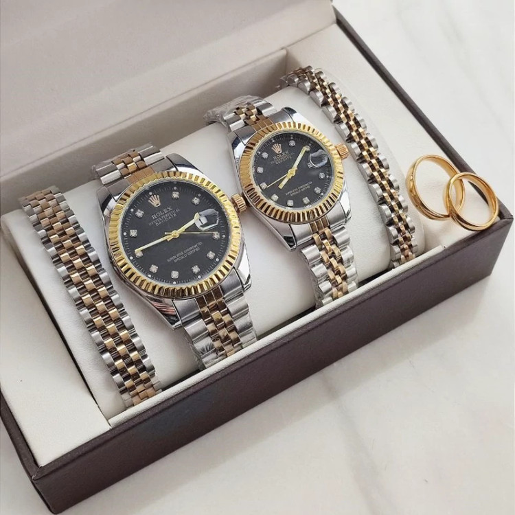 ست هدیه رولکس زنانه و مردانه شامل ساعت و دستبند و انگشتر رنگ ثابت مشکی