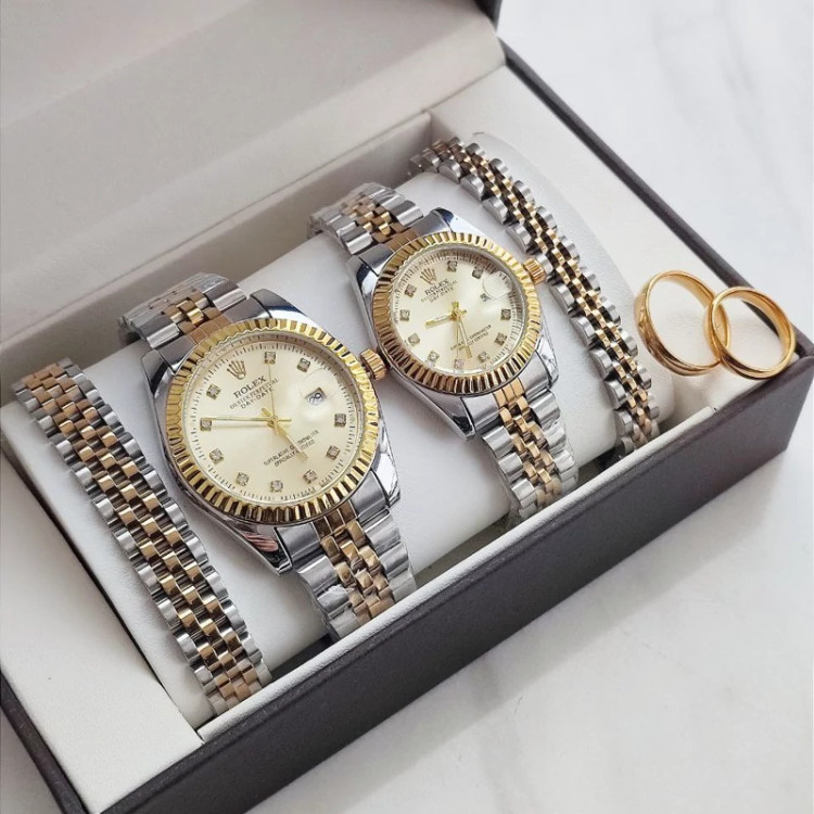 ست هدیه رولکس زنانه و مردانه شامل ساعت و دستبند و انگشتر رنگ ثابت