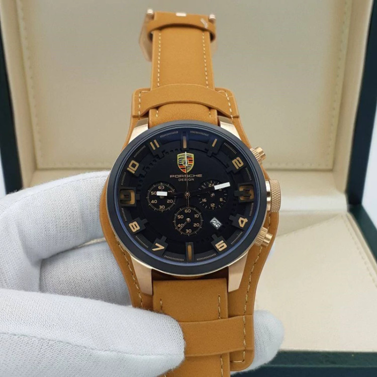 ساعت مردانه پورشه دیزاین بند چرمی سه موتوره فعال ساخت ژاپن بالاترین کیفیت A+++ شرکتی بدنه استیل رنگ ثابت و ضدحساسیت همراه با جعبه هدیه مخصوص ساعت