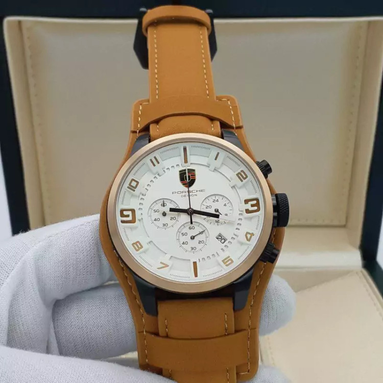 ساعت مردانه پورشه دیزاین چرمی سه موتوره فعال ساخت ژاپن بالاترین کیفیت A+++ شرکتی بدنه استیل رنگ ثابت و ضدحساسیت