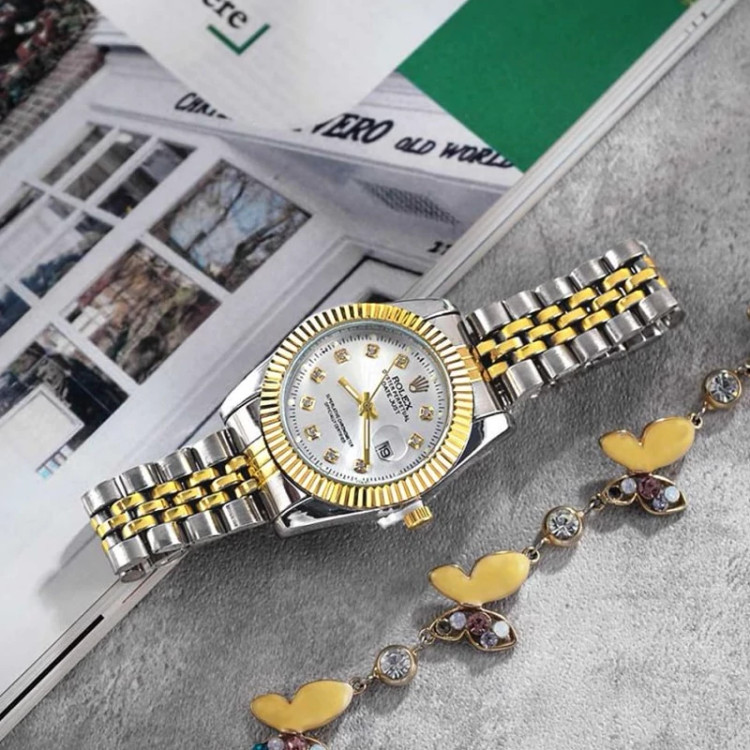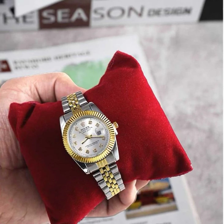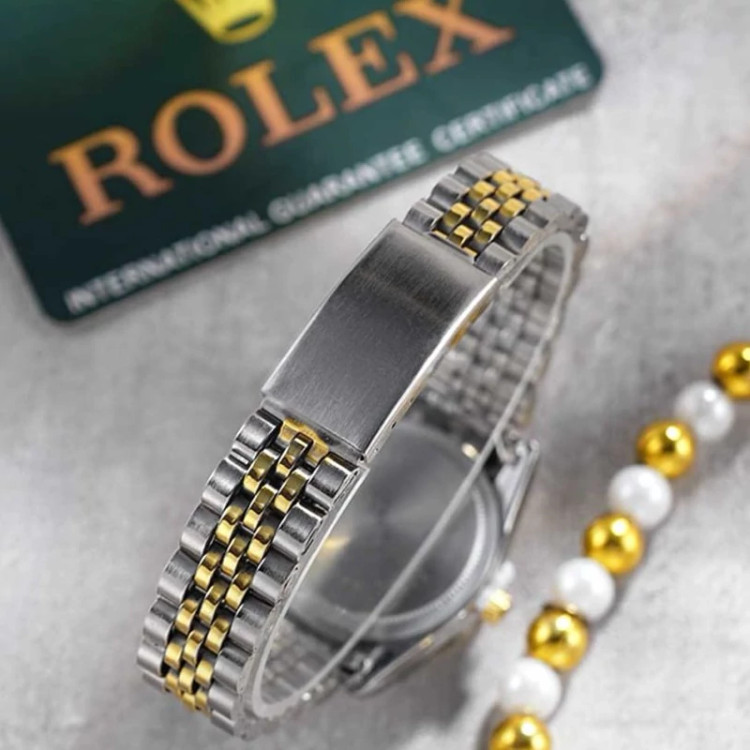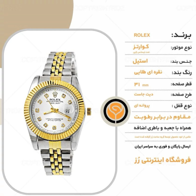 ساعت مچی زنانه رولکس ROLEX طرح دیت جاست مدل 1269 • قیمت حراجی • برند : ROLEX • مقاوم در برابر رطوبت • مناسب برای : بانوان • روزشمار : دارد • نوع قفل : کلیپسی • شیشه : آکرلیک • رنگ : نقره ای طلایی • جنس بند : استیل • رنگ بند : نقره ای طلایی • شکل صفحه: دایره ای • قطر صفحه : 31 میلیمتر • رنگ صفحه : سفید • درجه کیفیت موتور : کوارتز A++ • همراه با جعبه و باطری اضافه تمامی عکس ها از خود محصول در استدیو تخصصی رُز گرفته شده است .