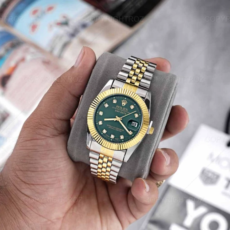 متاسفانه این کالا در حال حاضر موجود نیست. میتوانید از طریق لیست بالای صفحه، از محصولات مشابه این کالا دیدن نمایید.ساعت مچی مردانه رولکس ROLEX مدل 1627 • • برند : ROLEX • ضد آب در حد شست و شوی دست • مناسب برای : آقایان • روزشمار : دارد • نوع قفل : کلیپسی • شیشه : اکرلیک • جنس بند : استیل • رنگ بند : نقره ای طلایی • شکل صفحه: دایره ای • قطر صفحه : 35 میلیمتر • رنگ صفحه : سبز • درجه کیفیت موتور : کوارتز A++ • همراه با جعبه شکیل و باطری اضافه تمامی عکس ها از خود محصول در استدیو تخصصی رُز گرفته شده است ویژگی های خاص : تقویم تلسکوپی ، موتور کوارتز با کیفیت ، حک برند رولکس پشت صفحه ی ساعت