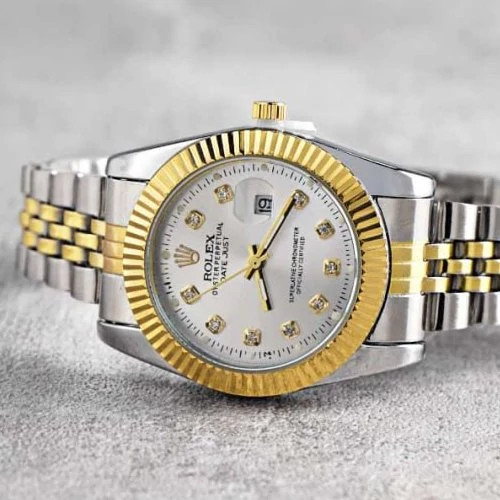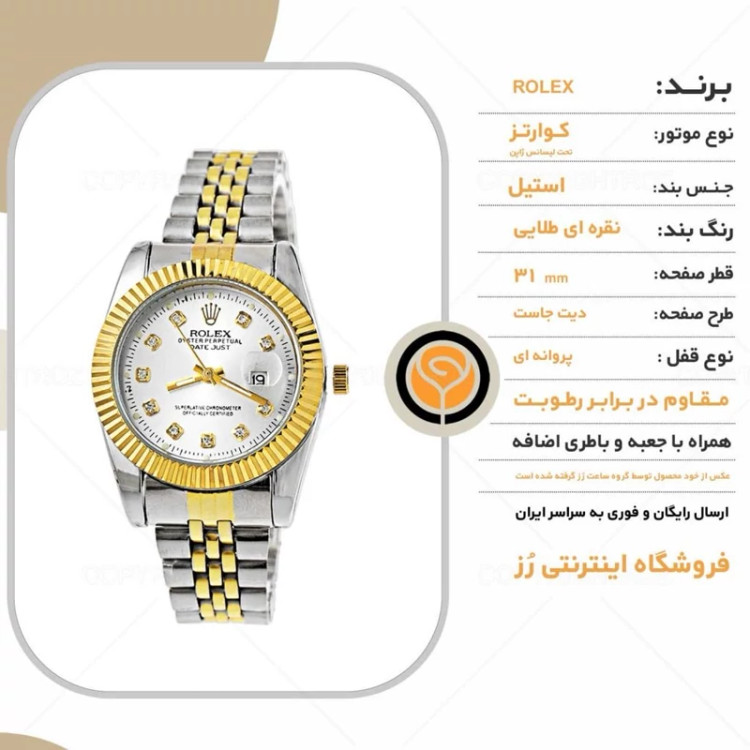 ساعت مچی زنانه رولکس ROLEX طرح دیت جاست مدل 1269 • قیمت حراج • برند : ROLEX • مقاوم در برابر رطوبت • مناسب برای : بانوان • روزشمار : دارد • نوع قفل : کلیپسی • شیشه : آکرلیک • رنگ : نقره ای طلایی • جنس بند : استیل • رنگ بند : نقره ای طلایی • شکل صفحه: دایره ای • قطر صفحه : 31 میلیمتر • رنگ صفحه : سفید • درجه کیفیت موتور : کوارتز A++ • همراه با جعبه و باطری اضافه تمامی عکس ها از خود محصول در استدیو تخصصی رُز گرفته شده است . ارسال رایگان