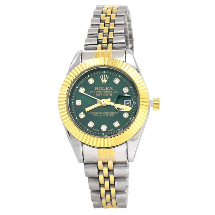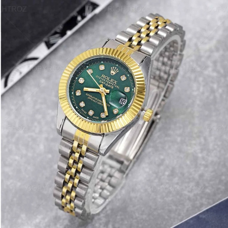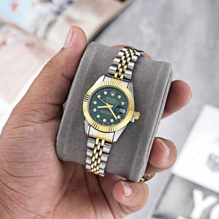 ساعت مچی زنانه رولکس ROLEX • برند : ROLEX • ضد آب در حد شست و شوی دست • مناسب برای : خانم ها • روزشمار : دارد • نوع قفل : کلیپسی • شیشه : اکرلیک • جنس بند : استیل • رنگ بند : نقره ای طلایی • شکل صفحه: دایره ای • قطر صفحه : 27 میلیمتر • رنگ صفحه : سبز • درجه کیفیت موتور : کوارتز A++ • همراه با جعبه شکیل و باطری اضافه تمامی عکس ها از خود محصول در استدیو تخصصی رُز گرفته شده است ویژگی های خاص : تقویم تلسکوپی ، موتور کوارتز با کیفیت . . . ارسال رایگان
