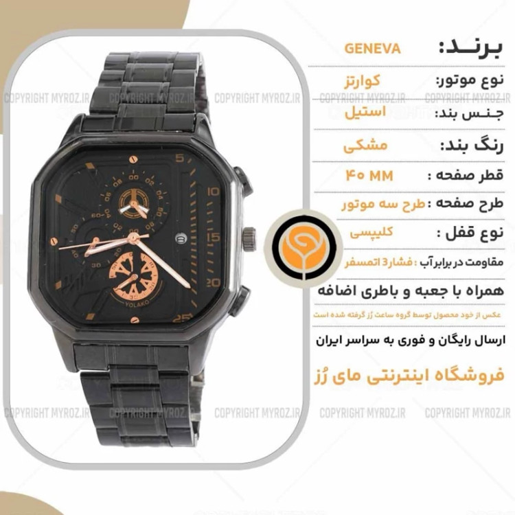 ساعت مچی مردانه جینوا GENEVA مدل 2093 • • برند : GENEVA • ضد آب 3 اتمسفر ( در حد پاشش آب 3ATM ) • مناسب برای : آقایان • روزشمار : دارد • نوع قفل : کلیپسی • شیشه : اکرلیک • جنس بند : استیل • رنگ بند : مشکی • شکل صفحه: مربع • قطر صفحه : 40 میلیمتر • رنگ صفحه : مشکی • وزن خالص : 80 گرم • درجه کیفیت موتور : کوارتز A++ • همراه با جعبه شکیل و باطری اضافه تمامی عکس ها از خود محصول در استدیو تخصصی مای رُز گرفته شده است ویژگی های خاص : طراحی جذاب و جدید، طرح سه موتوره ( تک موتوره ) تقویم فعال .
