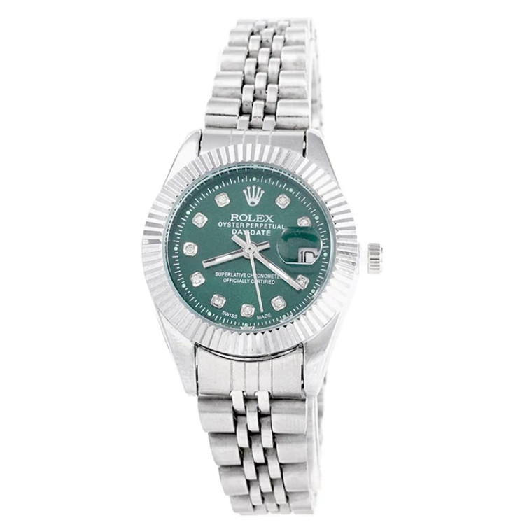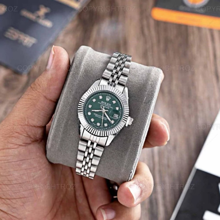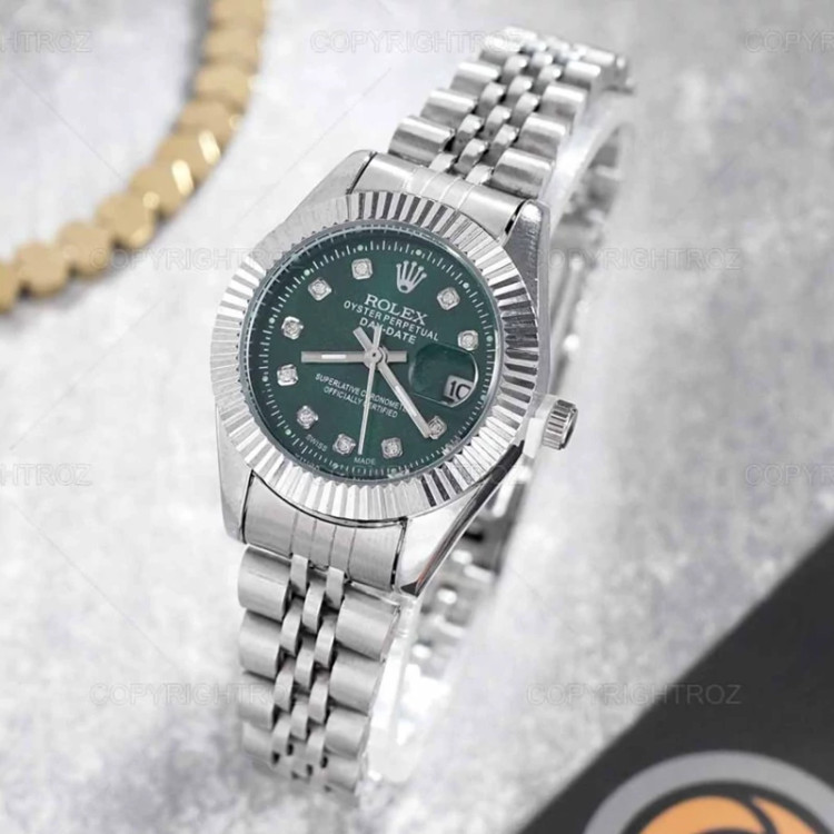 ساعت مچی زنانه رولکس ROLEX طرح دیت جاست مدل 1655 • • برند : ROLEX • ضد آب در حد شست و شوی دست • مناسب برای : خانم ها • روزشمار : دارد • نوع قفل : کلیپسی • شیشه : اکرلیک • جنس بند : استیل • رنگ بند : نقره ای • شکل صفحه: دایره ای • قطر صفحه : 27 میلیمتر • رنگ صفحه : سبز • درجه کیفیت موتور : کوارتز A++ • همراه با جعبه شکیل و باطری اضافه تمامی عکس ها از خود محصول در استدیو تخصصی مای رُز گرفته شده است ویژگی های خاص : تقویم تلسکوپی ، موتور کوارتز با کیفیت ، حک برند رولکس پشت صفحه ی ساعت . ارسال رایگان