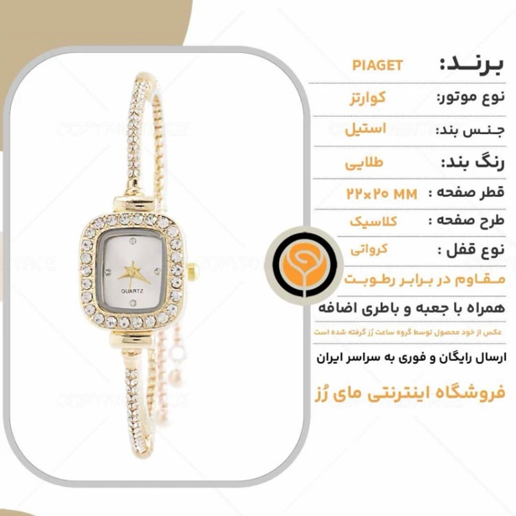 ساعت مچی زنانه پیاژه PIAGET مدل 1956 • • برند : PIAGET • ضد آب در حد شست و شوی دست • مناسب برای : خانم ها • روزشمار : دارد • نوع قفل : کرواتی • شیشه : اکرلیک • جنس بند : استیل • رنگ بند : طلایی • شکل صفحه: مستطیلی • قطر صفحه : 20×22 میلیمتر • رنگ صفحه : سفید • وزن خالص : 25 گرم • درجه کیفیت موتور : کوارتز A++ • همراه با جعبه شکیل و باطری اضافه تمامی عکس ها از خود محصول در استدیو تخصصی مای رُز گرفته شده است ویژگی های خاص : موتور کوارتز با کیفیت، قفل کرواتی،صفحه و بند نگین کاری شده . ارسال رایگان