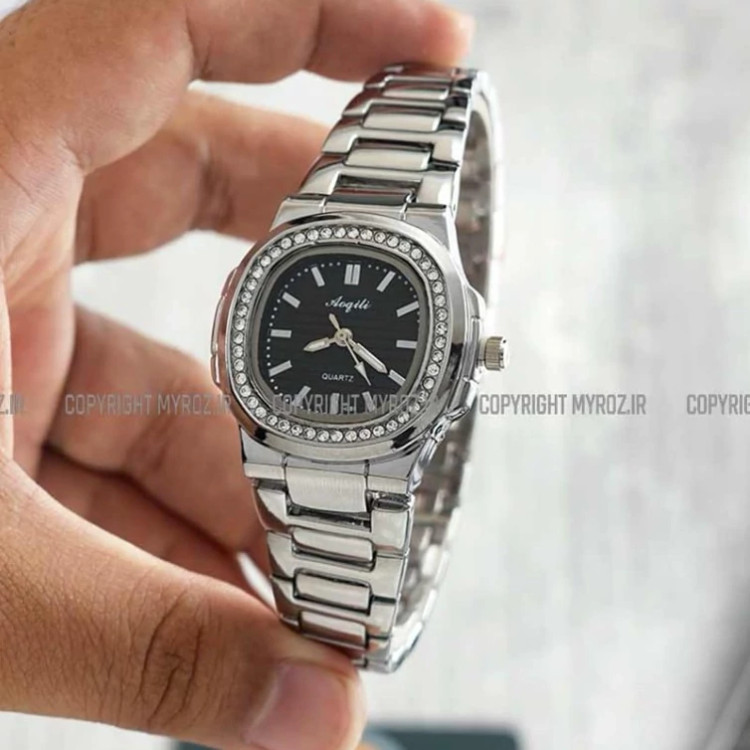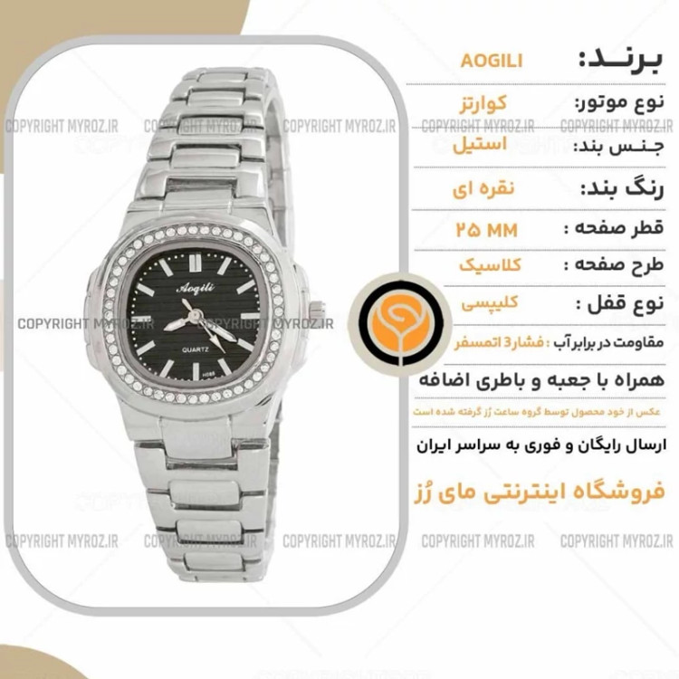 ساعت مچی زنانه AOGILI مدل 2208 • • برند : AOGILI • ضد آب 3 اتمسفر ( در حد پاشش آب 3ATM ) • مناسب برای : خانم ها • روزشمار : ندارد • نوع قفل : کلیپسی • شیشه : اکرلیک • جنس بند : استیل • رنگ بند : نقره ای • شکل صفحه: مربع • قطر صفحه : 25 میلیمتر • رنگ صفحه : مشکی • وزن خالص : 75 گرم • درجه کیفیت موتور : کوارتز A++ • همراه با جعبه شکیل و باطری اضافه تمامی عکس ها از خود محصول در استدیو تخصصی مای رُز گرفته شده است .