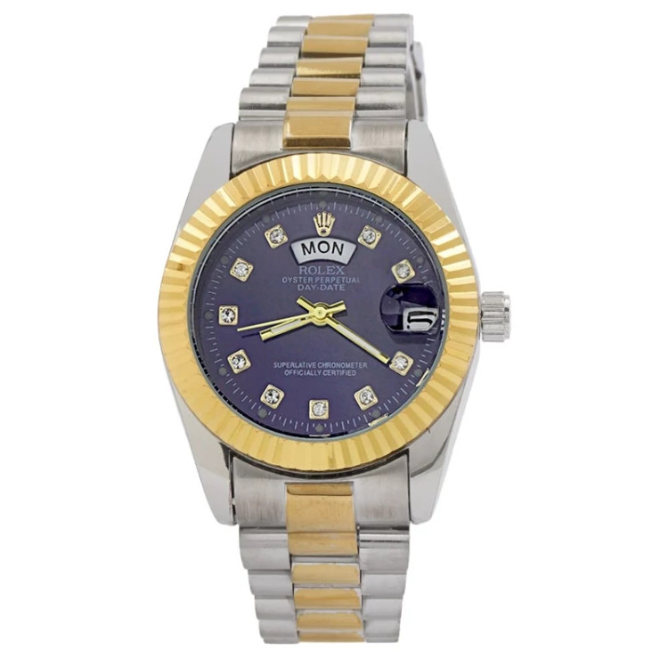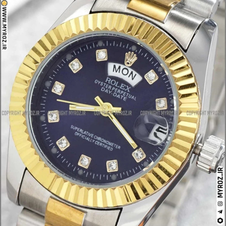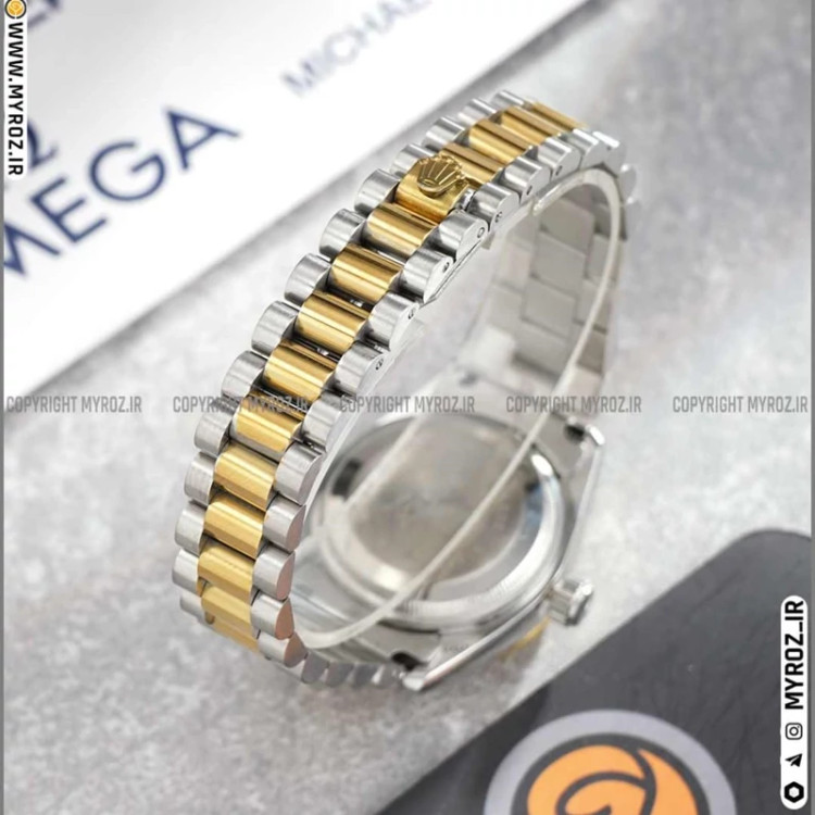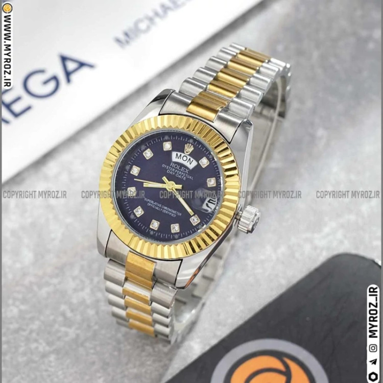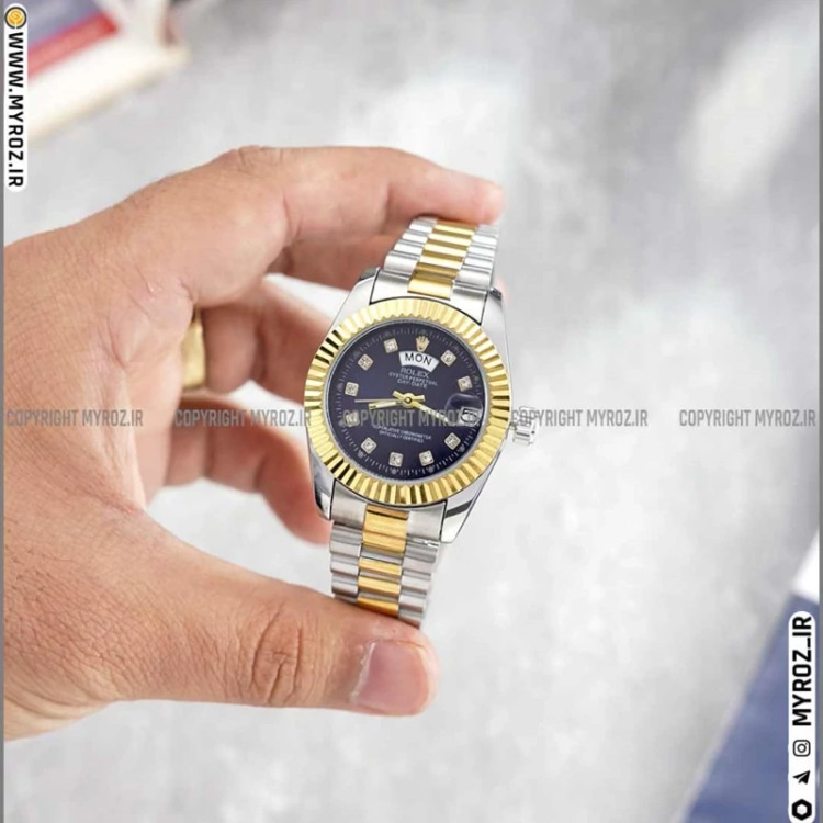 ساعت مچی زنانه رولکس ROLEX طرح DAY DATE مدل 2054 • برند : ROLEX • ضد آب 3 اتمسفر ( در حد پاشش آب 3ATM ) • مناسب برای : خانم ها • روزشمار : دارد • نوع قفل : اصلی رولکس • شیشه : سافایر ضد خش • جنس بند : استیل • رنگ بند : نقره ای طلایی • شکل صفحه: دایره ای • قطر صفحه : 30 میلیمتر • رنگ صفحه : آبی • وزن خالص : 75 گرم • درجه کیفیت موتور : کوارتز A++ • همراه با جعبه شکیل و باطری اضافه تمامی عکس ها از خود محصول در استدیو تخصصی مای رُز گرفته شده است ویژگی های خاص : موتور شرکتی با کیفیت ، حک برند رولکس پشت صفحه ی ساعت ،روی قفل و روی سرکوک ،تقویم ایام هفته،صفحه ی شب نما و بالاترین کیفیت موجود .