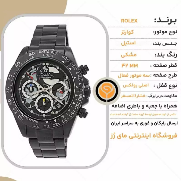 ساعت مچی مردانه رولکس ROLEX طرح Daytona مدل 2021 • • برند : ROLEX • ضد آب 3 اتمسفر ( در حد پاشش آب 3ATM ) • مناسب برای : آقایان • روزشمار : دارد • نوع قفل : اصلی رولکس • شیشه : سافایر کریستال • جنس بند : استیل • رنگ بند : مشکی • شکل صفحه: دایره ای • قطر صفحه : 42 میلیمتر • رنگ صفحه : مشکی • وزن خالص : 140 گرم • درجه کیفیت موتور : کوارتز A++ • همراه با جعبه شکیل و باطری اضافه تمامی عکس ها از خود محصول در استدیو تخصصی مای رُز گرفته شده است ویژگی های خاص : سه موتور فعال و کرنوگراف | تاچیمتر | حک برند روی قفل و سرکوک | سرکوک پیچی | رنگ ثابت . . ارسال رایگان