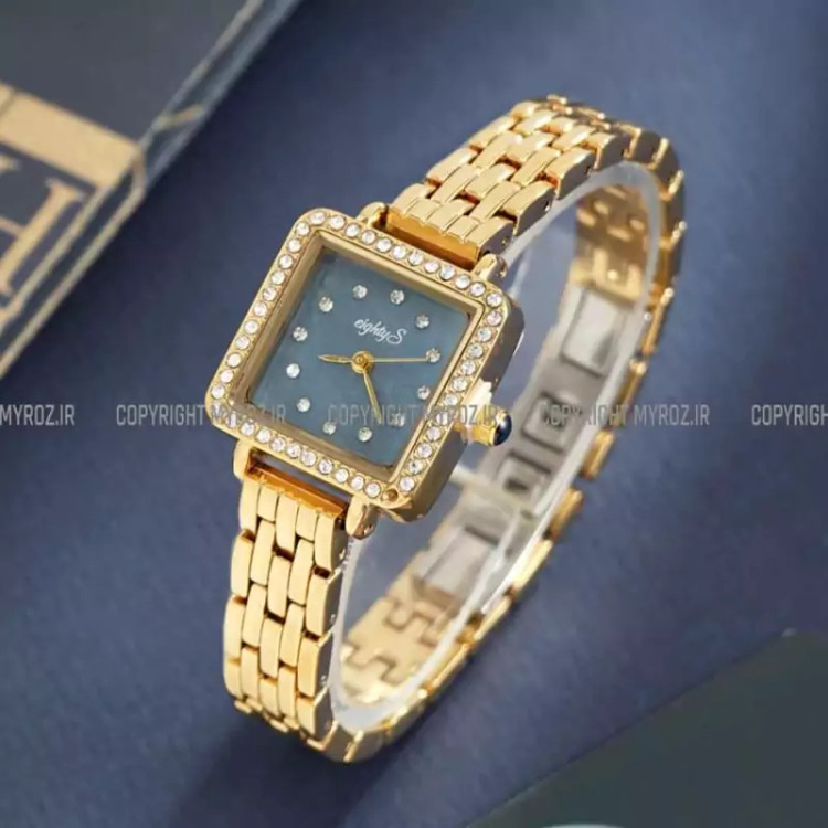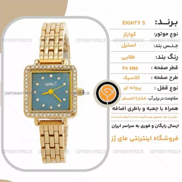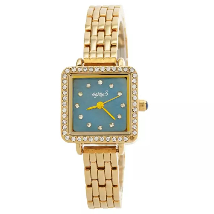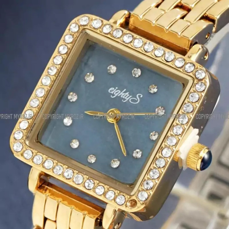 ساعت مچی زنانه جواهری EIGHTY S مدل 2206 • برند : EIGHTY S • ضد آب 3 اتمسفر ( در حد پاشش آب 3ATM ) • مناسب برای : خانم ها • روزشمار : ندارد • نوع قفل :پروانه ای • شیشه : اکرلیک • جنس بند : استیل • رنگ بند : طلایی • شکل صفحه: مربع • قطر صفحه : 20 میلیمتر • رنگ صفحه : آبی • وزن خالص : 50 گرم • درجه کیفیت موتور : کوارتز A++ • همراه با جعبه شکیل و باطری اضافه تمامی عکس ها از خود محصول در استدیو تخصصی مای رُز گرفته شده است .