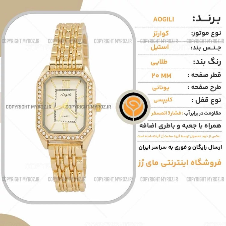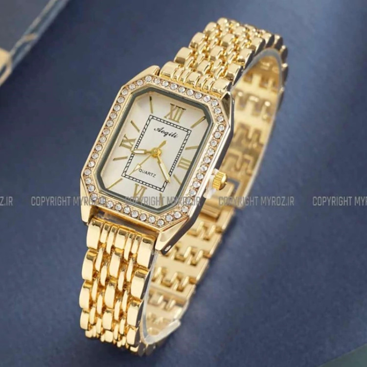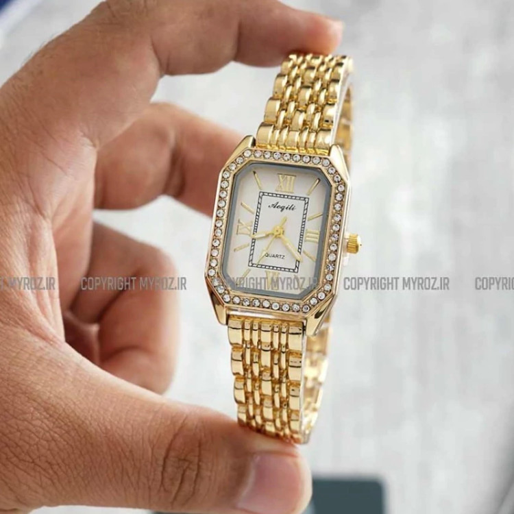 ساعت مچی زنانه AOGILI مدل 2213 • • برند : AOGILI • ضد آب 3 اتمسفر ( در حد پاشش آب 3ATM ) • مناسب برای : خانم ها • روزشمار : ندارد • نوع قفل : کلیپسی • شیشه : اکرلیک • جنس بند : استیل • رنگ بند : طلایی • شکل صفحه: مربع • قطر صفحه : 20 میلیمتر • رنگ صفحه : سفید • وزن خالص : 55 گرم • درجه کیفیت موتور : کوارتز A++ • همراه با جعبه شکیل و باطری اضافه تمامی عکس ها از خود محصول در استدیو تخصصی مای رُز گرفته شده است .