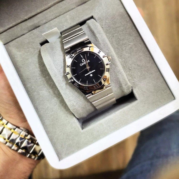 ساعت مچی زنانه اُمگا OMEGA مدل 1997 • قیمت : 285 هزارتومان • برند : OMEGA • ضد آب در حد پاشش آب ( 3ATM ) • مناسب برای : خانم ها • روزشمار : ندارد • نوع قفل : کلیپسی • شیشه : اکرلیک • جنس بند : استیل • رنگ بند : نقره ای • شکل صفحه: دایره ای • قطر صفحه : 30 میلیمتر • رنگ صفحه : مشکی • وزن خالص :60 گرم • درجه کیفیت موتور : کوارتز A++ • همراه با جعبه شکیل و باطری اضافه تمامی عکس ها از خود محصول در استدیو تخصصی مای رُز گرفته شده است ویژگی های خاص : موتور با کیفیت کوارتز، حک برند پشت صفحه ساعت و روی قفل، ضد زنگ، رنگ ثابت .
