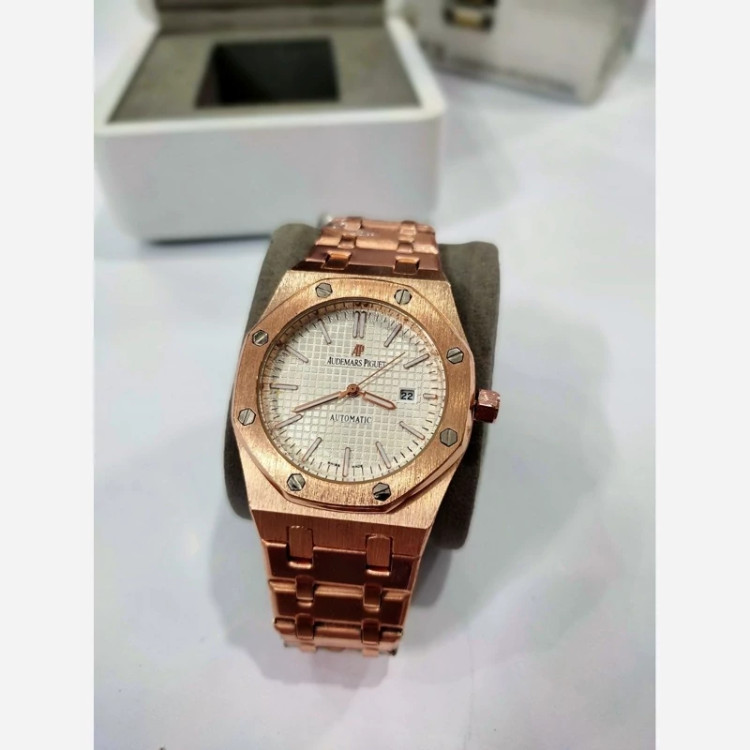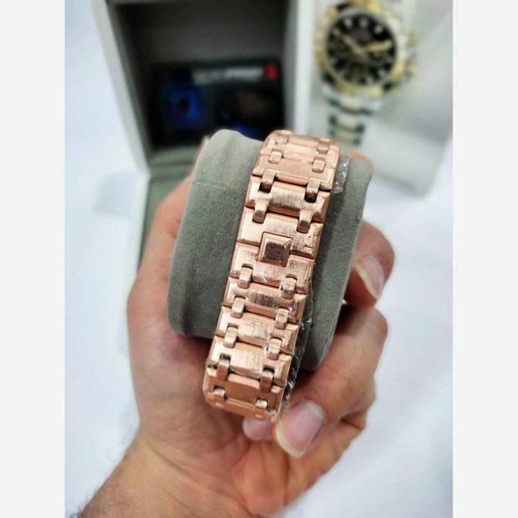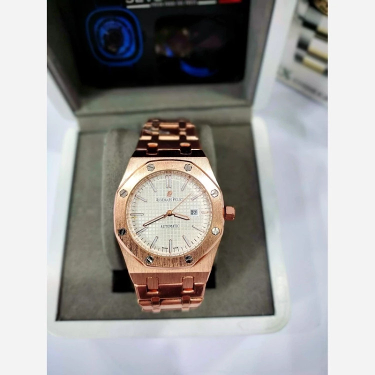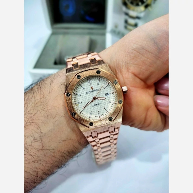 ✅ ساعت مچی مردانه AUDEMARS PIGUET مدل 2349 • • برند : AUDEMARS PIGUET • ضد آب 5 اتمسفر (5ATM ) • مناسب برای : آقایان • روزشمار : دارد • نوع قفل : کلیپسی • شیشه : سافایر • جنس بند : استیل • رنگ بند : رزگلد • شکل صفحه: دایره ای • رنگ صفحه : سفید • درجه کیفیت موتور : کوارتز SL • همراه با جعبه شکیل و باطری اضافه تمامی عکس ها از خود محصول در استدیو تخصصی مای رُز گرفته شده است ویژگی های خاص : موتور شرکتی با کیفیت رنگ ثابت