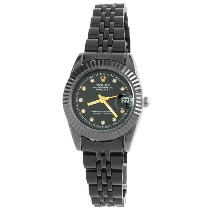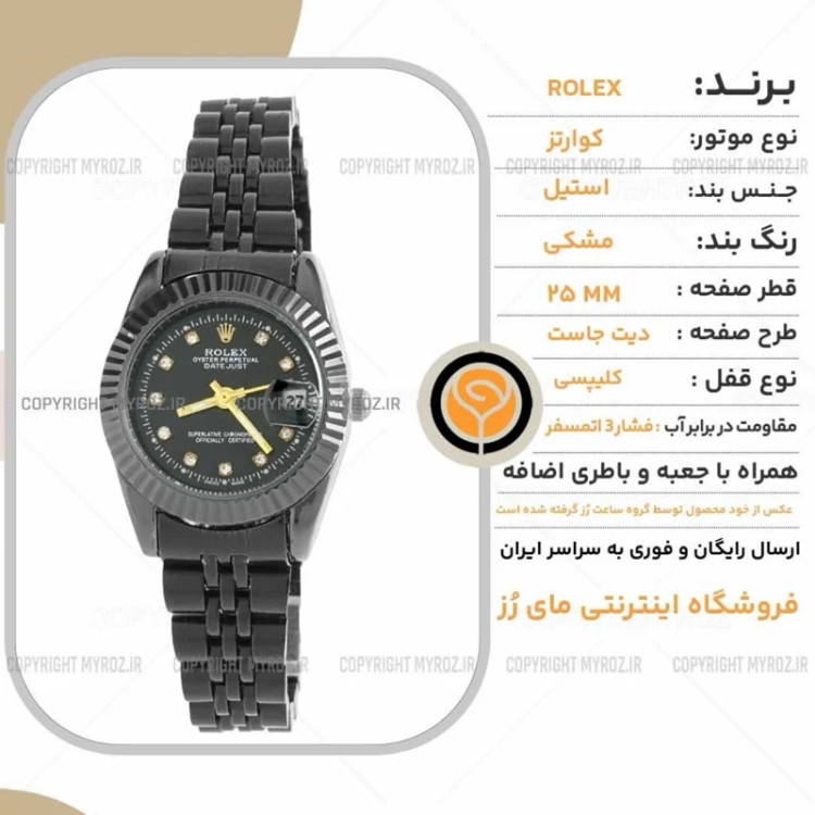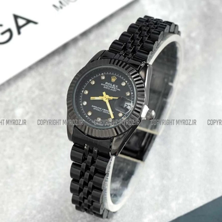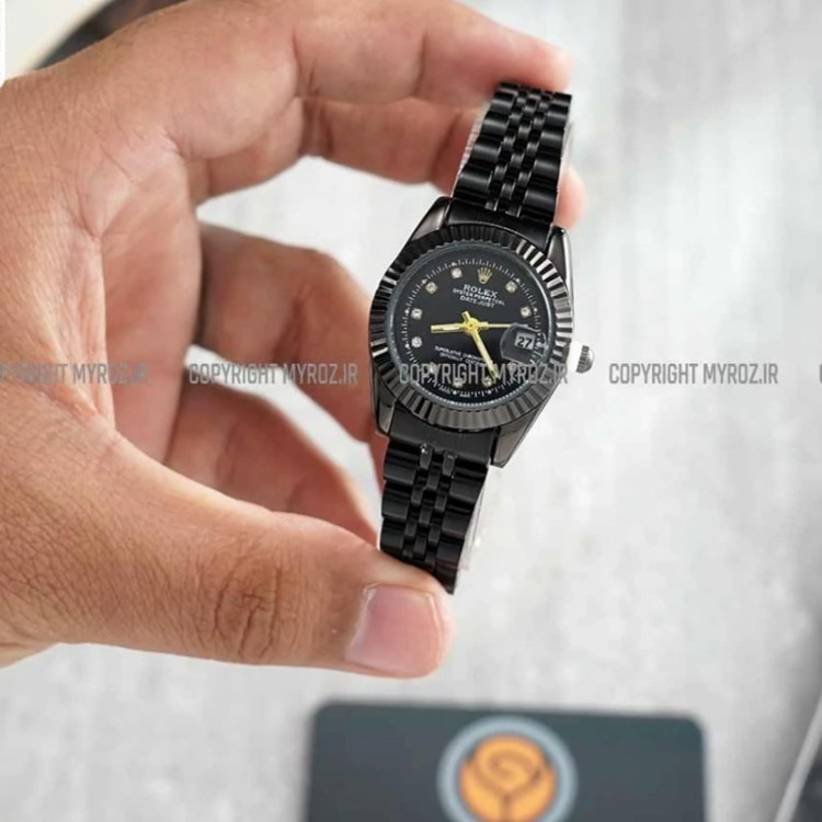 ساعت مچی زنانه رولکس ROLEX طرح دیت جاست مدل 2115 • • برند : ROLEX • ضد آب 3 اتمسفر ( در حد پاشش آب 3ATM ) • مناسب برای : خانم ها • روزشمار : دارد • نوع قفل : کلیپسی • شیشه : اکرلیک • جنس بند : استیل • رنگ بند : مشکی • شکل صفحه: دایره • قطر صفحه : 25 میلیمتر • رنگ صفحه : مشکی • وزن خالص : 45 گرم • درجه کیفیت موتور : کوارتز A++ • همراه با جعبه شکیل و باطری اضافه تمامی عکس ها از خود محصول در استدیو تخصصی مای رُز گرفته شده است ویژگی های خاص : حک برند روی قفل،موتور با کیفیت، طراحی میمینال و پرطرفدار ، .