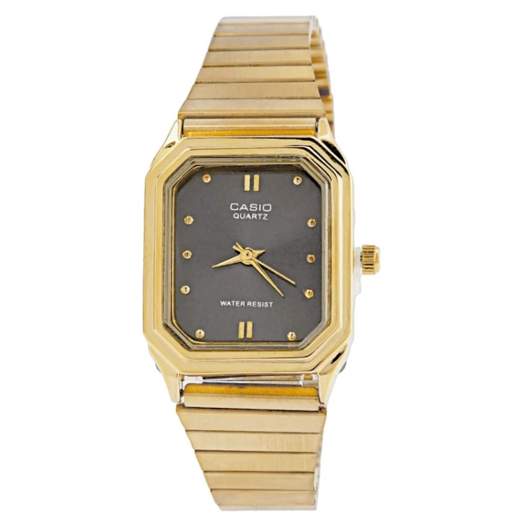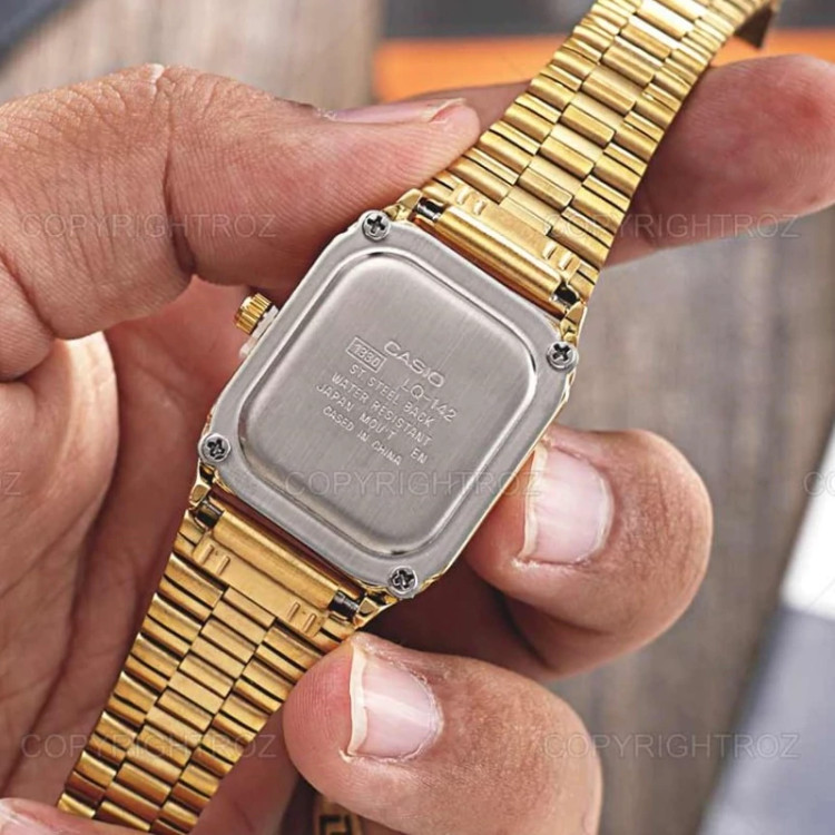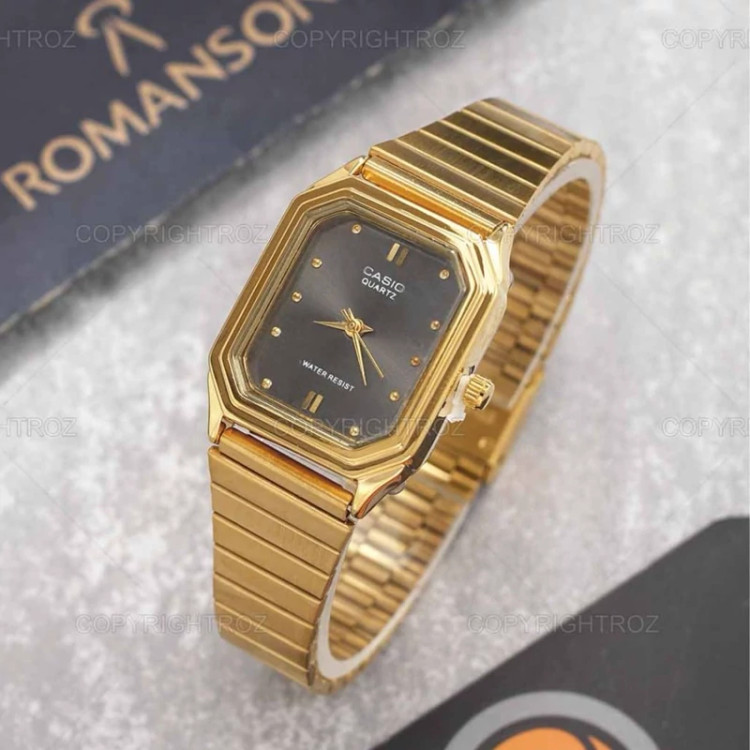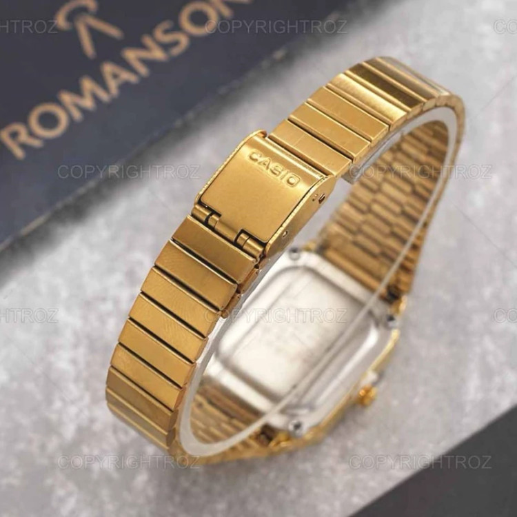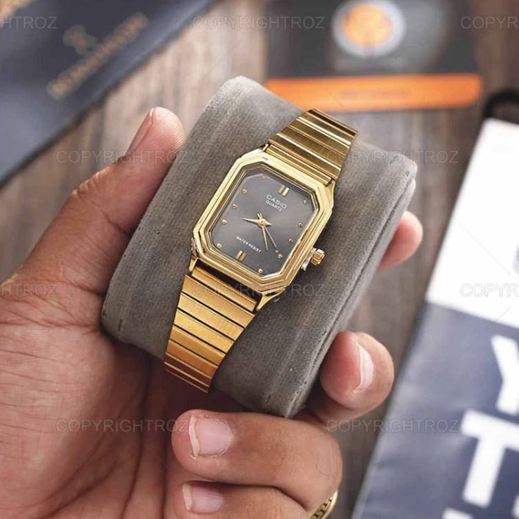 ساعت مچی زنانه کاسیو CASIO مدل 1749 • • برند : CASIO • مقاوم در برابر آب • مناسب برای : خانم ها • روزشمار : ندارد • نوع قفل : سگک • شیشه : سافایر ضد خش • جنس بند : استیل • رنگ بند : طلایی • شکل صفحه: مستطیل • قطر صفحه : 22×27 میلیمتر • رنگ صفحه : مشکی • وزن خالص : 50 گرم • درجه کیفیت موتور : کوارتز A++ • همراه با جعبه شکیل و باطری اضافه تمامی عکس ها از خود محصول در استدیو تخصصی مای رُز گرفته شده است ویژگی های خاص : موتور شرکتی با کیفیت ، حک برند پشت صفحه ی ساعت ،روی قفل و رنگ ثابت .