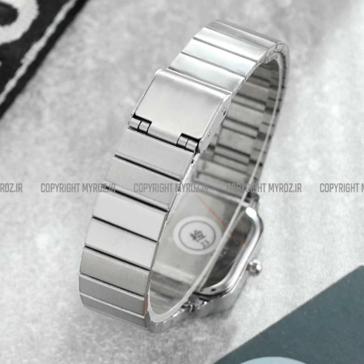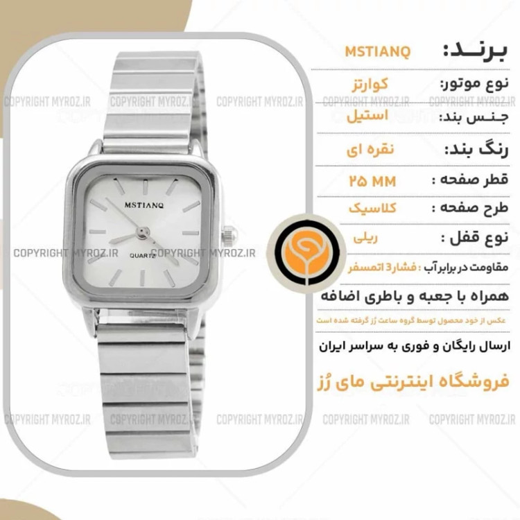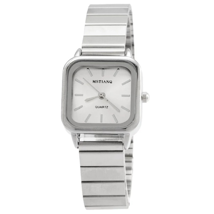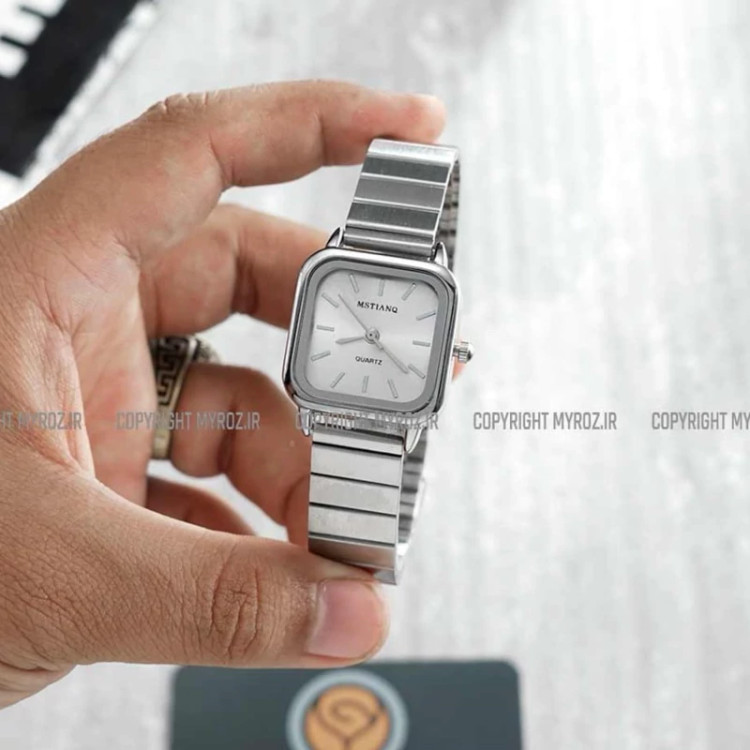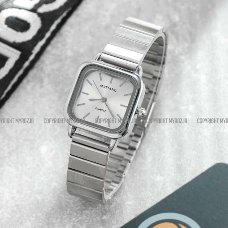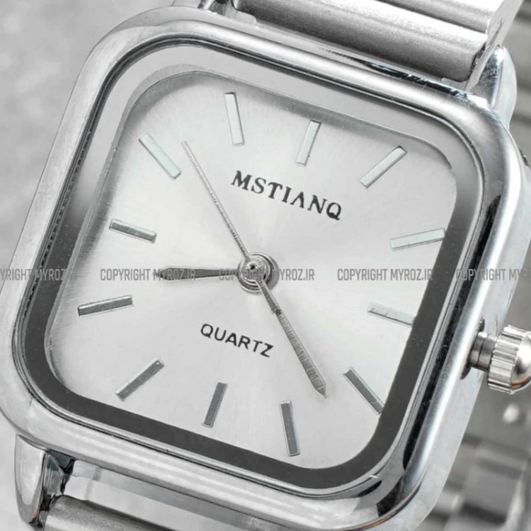 ساعت مچی زنانه اچنگی MSTIANQ مدل 2184 • برند : MSTIANQ • ضد آب 3 اتمسفر ( در حد پاشش آب 3ATM ) • مناسب برای : خانم ها • روزشمار : ندارد • نوع قفل :ریلی • شیشه : اکرلیک • جنس بند : استیل • رنگ بند : نقره ای • شکل صفحه: مربع • قطر صفحه : 25 میلیمتر • رنگ صفحه : سفید • وزن خالص : 55 گرم • درجه کیفیت موتور : کوارتز A++ • همراه با جعبه شکیل و باطری اضافه تمامی عکس ها از خود محصول در استدیو تخصصی مای رُز گرفته شده است .