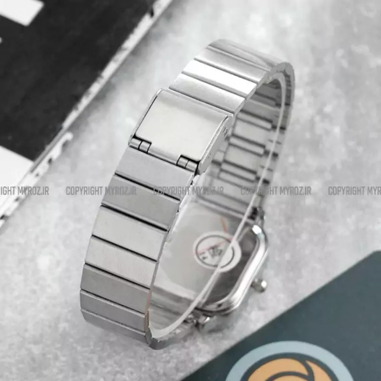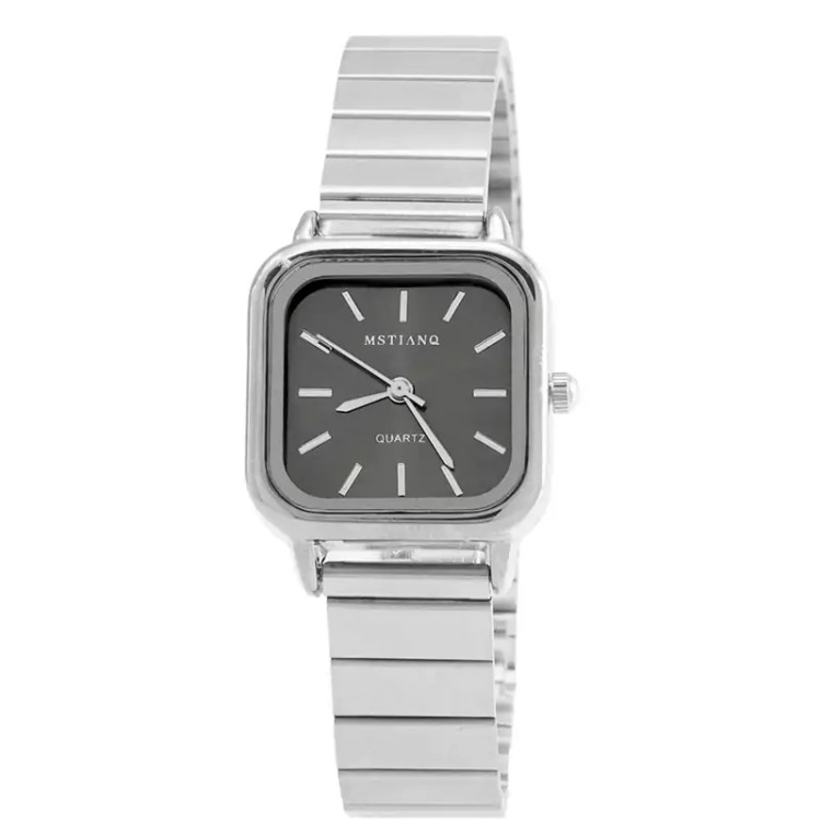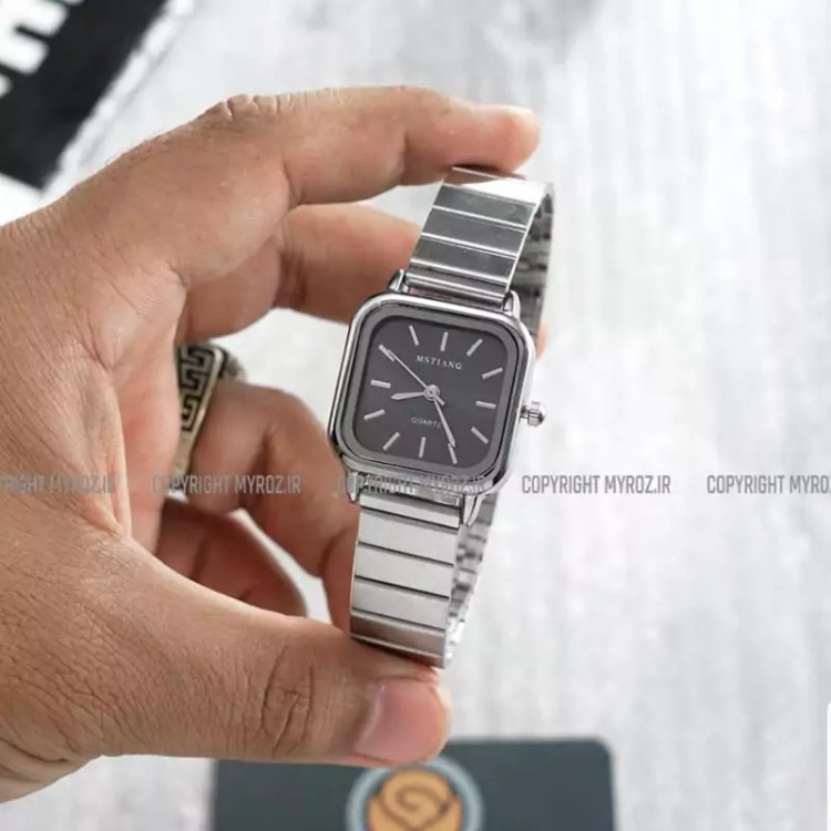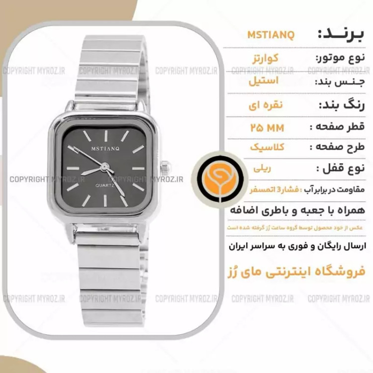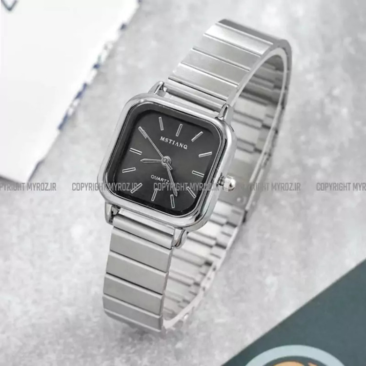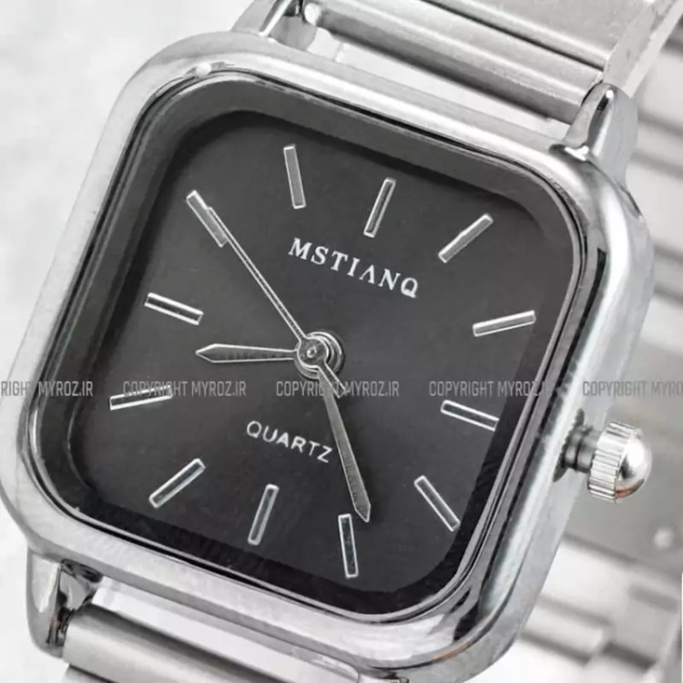 ساعت مچی زنانه اچنگی MSTIANQ مدل 2183 • برند : MSTIANQ • ضد آب 3 اتمسفر ( در حد پاشش آب 3ATM ) • مناسب برای : خانم ها • روزشمار : ندارد • نوع قفل :ریلی • شیشه : اکرلیک • جنس بند : استیل • رنگ بند : نقره ای • شکل صفحه: مربع • قطر صفحه : 25 میلیمتر • رنگ صفحه : مشکی • وزن خالص : 55 گرم • درجه کیفیت موتور : کوارتز A++ • همراه با جعبه شکیل و باطری اضافه تمامی عکس ها از خود محصول در استدیو تخصصی مای رُز گرفته شده است .