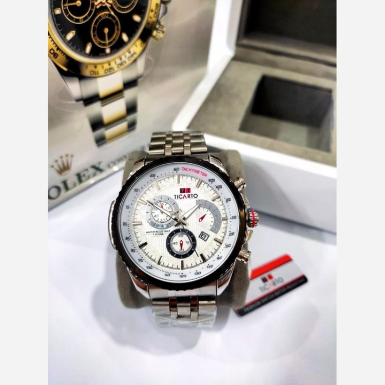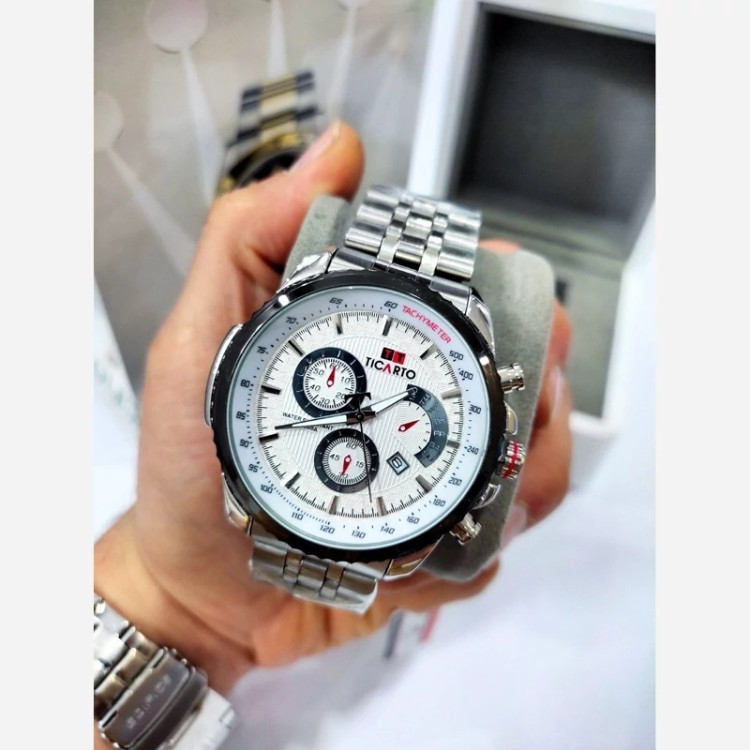ساعت مچی مردانه TICARTO مدل 2240 • • برند : TICARTO • ضد آب 3 اتمسفر • مناسب برای : آقایان • روزشمار : دارد • نوع قفل : کلیپسی • شیشه : سافایر • جنس بند : استیل • رنگ بند : نقره ای • شکل صفحه: دایره ای • قطر صفحه : 40 میلیمتر • رنگ صفحه : سفید • وزن خالص : گرم • درجه کیفیت موتور : کوارتز A++ • همراه با جعبه شکیل و باطری اضافه .