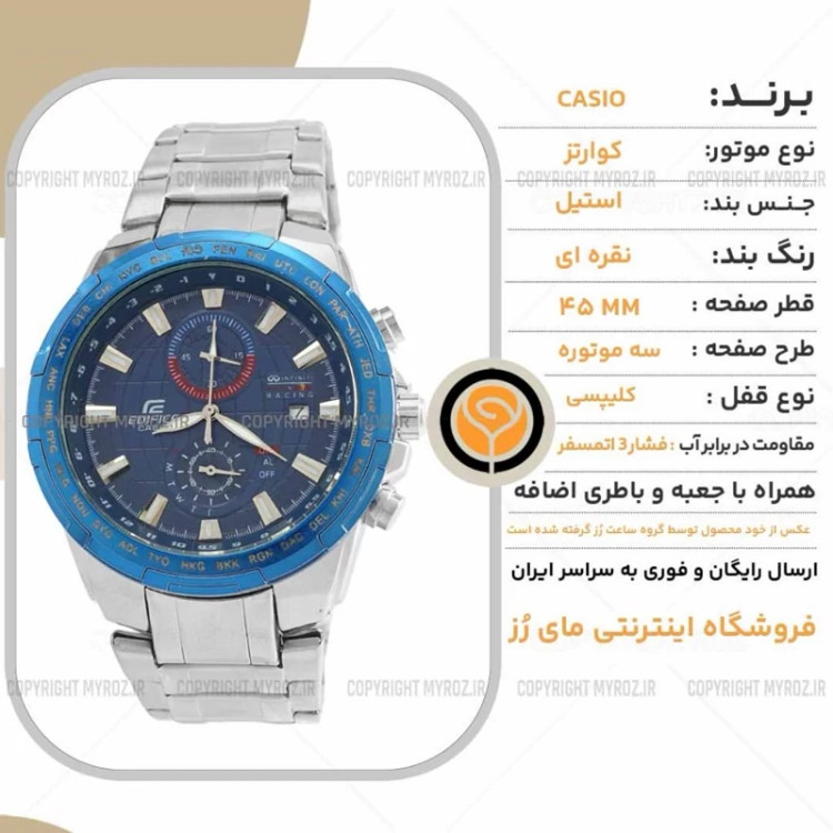 ساعت مچی مردانه کاسیو CASIO طرح ادیفایس مدل 2232 • برند : CASIO • ضد آب 3 اتمسفر ( در حد پاشش آب 3ATM ) • مناسب برای : آقایان • روزشمار : دارد • نوع قفل : کلیپسی • شیشه : سافایر • جنس بند : استیل • رنگ بند : نقره ای • شکل صفحه: دایره ای • قطر صفحه : 45 میلیمتر • رنگ صفحه : مشکی • وزن خالص : 180 گرم • درجه کیفیت موتور : کوارتز A++ • همراه با جعبه شکیل و باطری اضافه • ویژگی های خاص : حک برند پشت صفحه ساعت ، حک برند روی قفل ، حک برند روی سرکوک،سه موتور فعال و کرنوگراف ، رنگ ثابت تمامی عکس ها از خود محصول در استدیو تخصصی مای رُز گرفته شده است .