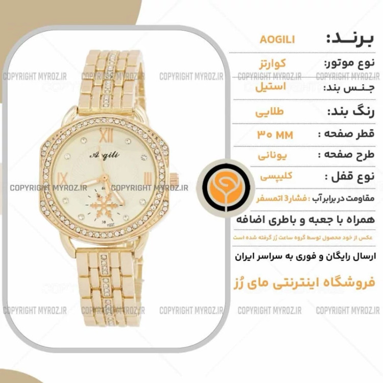 ساعت مچی زنانه AOGILI مدل 2217 • • برند : AOGILI • ضد آب 3 اتمسفر ( در حد پاشش آب 3ATM ) • مناسب برای : خانم ها • روزشمار : ندارد • نوع قفل : کلیپسی • شیشه : اکرلیک • جنس بند : استیل • رنگ بند : طلایی • شکل صفحه: مربع • قطر صفحه : 30 میلیمتر • رنگ صفحه : سفید • وزن خالص : 75 گرم • درجه کیفیت موتور : کوارتز A++ • همراه با جعبه شکیل و باطری اضافه تمامی عکس ها از خود محصول در استدیو تخصصی مای رُز گرفته شده است .