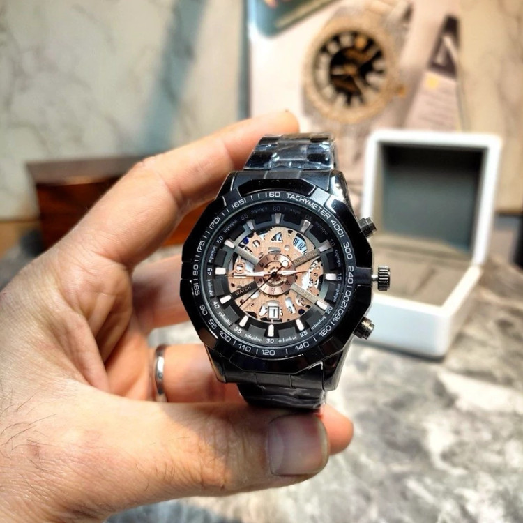 ساعت مچی مردانه بین باند BINBOND صفحه اسکلتون مدل 1895 • • برند : BINBOND • مقاوم در برابر آب • مناسب برای : آقایان • روزشمار : دارد • نوع قفل : کلیپسی ضامن دار • شیشه : سافایر ضد خش • جنس بند : استیل • رنگ بند : مشکی • شکل صفحه: دایره ای • قطر صفحه : 45 میلیمتر • رنگ صفحه : طلایی • وزن خالص : 120 گرم • درجه کیفیت موتور : کوارتز A++ • همراه با جعبه شکیل و باطری اضافه تمامی عکس ها از خود محصول در استدیو تخصصی مای رُز گرفته شده است ویژگی های خاص : موتور شرکتی با کیفیت ، صفحه ی اسکلتون و موتور نمایان ، صفحه ی چرخ دنده ای، رنگ ثابت و صفحه ی شب نما .