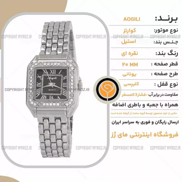 ساعت مچی زنانه AOGILI مدل 2211 • برند : AOGILI • ضد آب 3 اتمسفر ( در حد پاشش آب 3ATM ) • مناسب برای : خانم ها • روزشمار : ندارد • نوع قفل : کلیپسی • شیشه : اکرلیک • جنس بند : استیل • رنگ بند : نقره ای • شکل صفحه: مربع • قطر صفحه : 25 میلیمتر • رنگ صفحه : مشکی • وزن خالص : 70 گرم • درجه کیفیت موتور : کوارتز A++ • همراه با جعبه شکیل و باطری اضافه تمامی عکس ها از خود محصول در استدیو تخصصی مای رُز گرفته شده است .