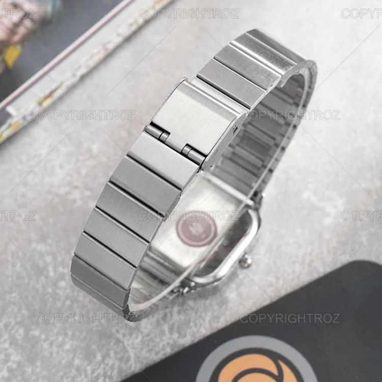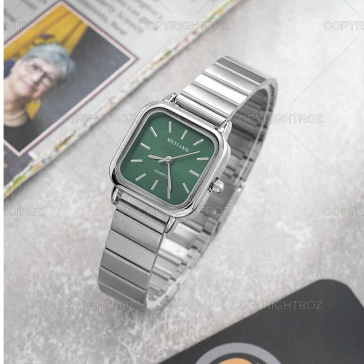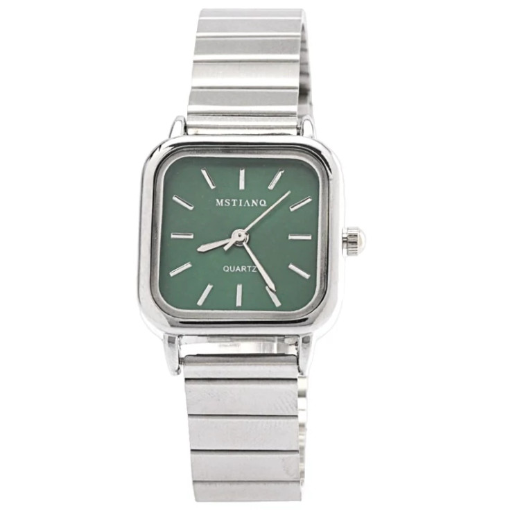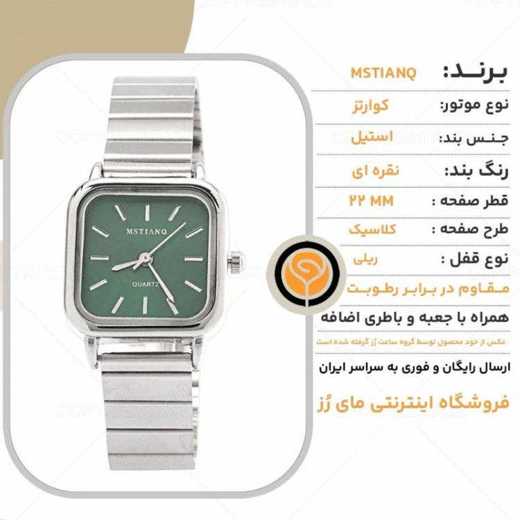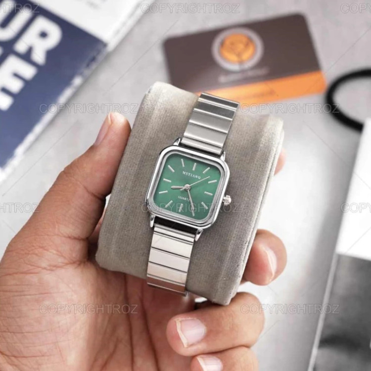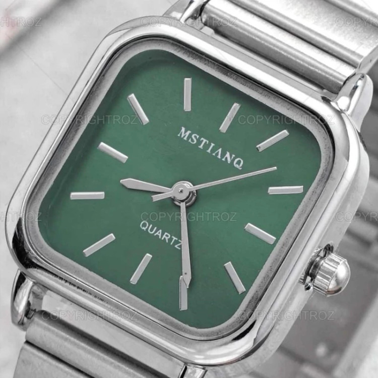 ساعت مچی زنانه MSTIANQ مدل 1869 • • برند : MSTIANQ • ضد آب در حد شست و شوی دست • مناسب برای : خانم ها • روزشمار : ندارد • نوع قفل : ریلی • شیشه : اکرلیک • جنس بند : استیل • رنگ بند : نقره ای • شکل صفحه: مربعی • قطر صفحه : 28 میلیمتر • رنگ صفحه : سبز • وزن خالص : 50 گرم • درجه کیفیت موتور : کوارتز A++ • همراه با جعبه شکیل و باطری اضافه تمامی عکس ها از خود محصول در استدیو تخصصی مای رُز گرفته شده است ویژگی های خاص : بسیار ظریف و مناسب برای خانم ها ، رنگ بندی متنوع ، قفل ریلی و موتور با کیفیت کوارتز ، حک برند پشت صفحه ساعت و رنگ ثابت . .