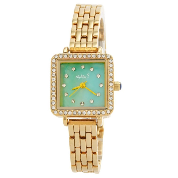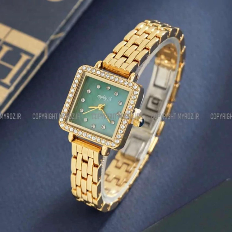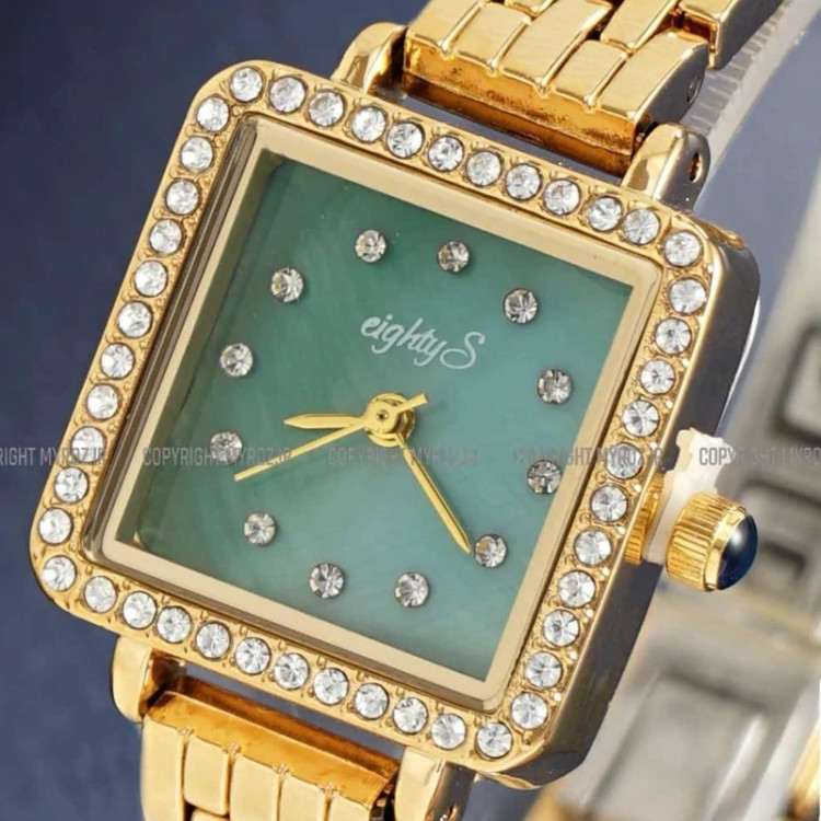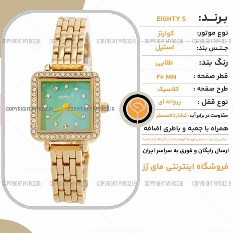 ساعت مچی زنانه جواهری EIGHTY S مدل 2207 • برند : EIGHTY S • ضد آب 3 اتمسفر ( در حد پاشش آب 3ATM ) • مناسب برای : خانم ها • روزشمار : ندارد • نوع قفل :پروانه ای • شیشه : اکرلیک • جنس بند : استیل • رنگ بند : طلایی • شکل صفحه: مربع • قطر صفحه : 20 میلیمتر • رنگ صفحه : سبز • وزن خالص : 50 گرم • درجه کیفیت موتور : کوارتز A++ • همراه با جعبه شکیل و باطری اضافه تمامی عکس ها از خود محصول در استدیو تخصصی مای رُز گرفته شده است .